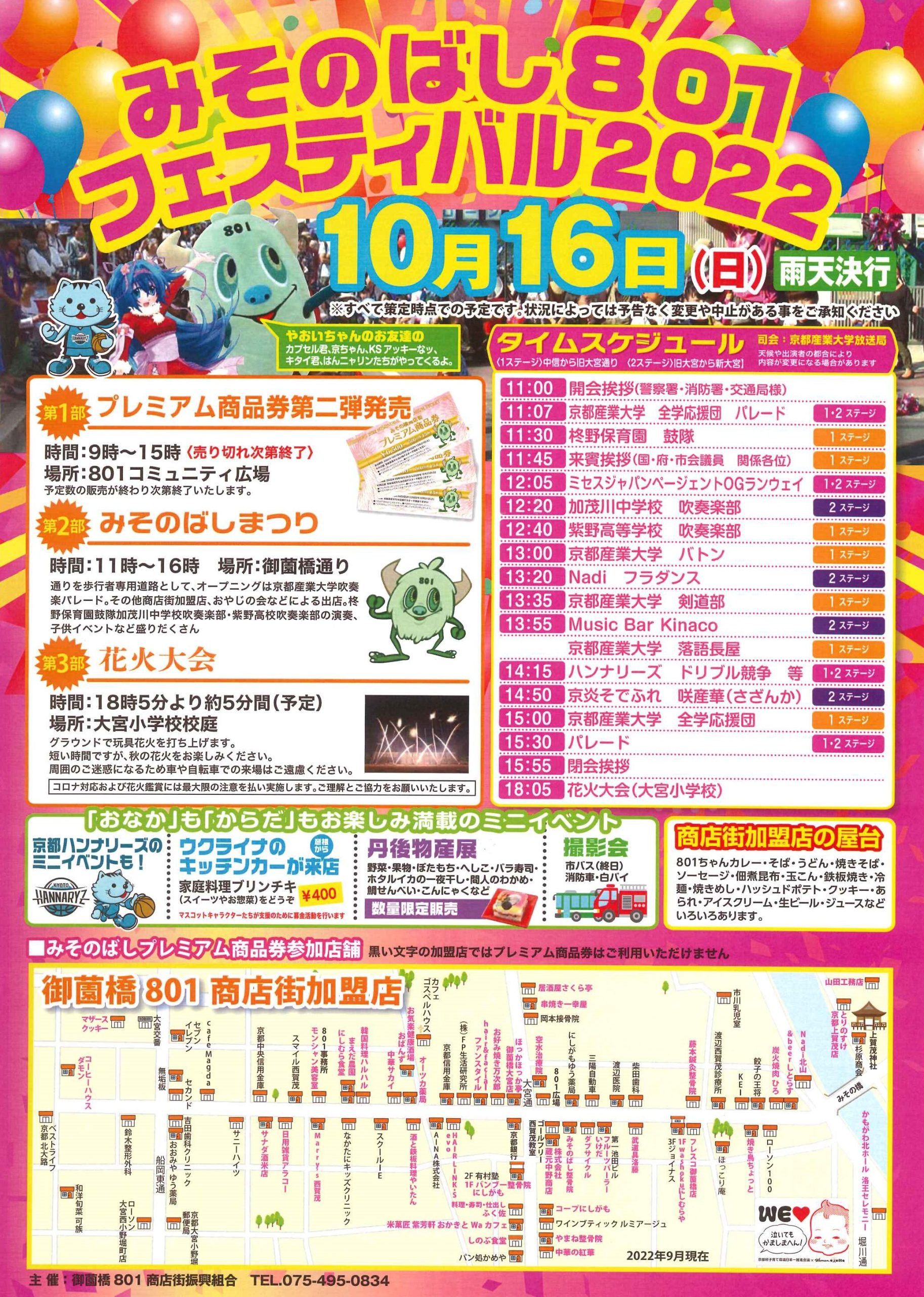 御薗橋通新大宮交差点~牛若通までを歩行者専用エリアとし、オープニングは京都産業大学吹奏楽によるパレード。柊野保育園鼓隊・加茂川中学校吹奏楽部・紫野高校吹奏楽部の演奏。